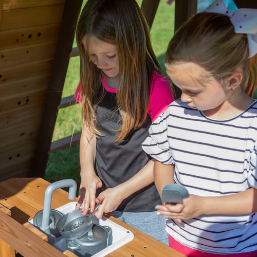 Double the fun with Backyard Discovery’s Tacoma Falls Swing Set, a versatile outdoor playground delivering an adventure-packed experience. This stylish wooden playset features an upper clubhouse and a lower playhouse, each designed to spark imagination and creativity. The clubhouse feels like home with charming windows, a wooden roof, and a built-in chalkboard that’s perfect for budding artists. A crow’s nest lookout with a toy telescope invites little explorers to embark on imaginative journeys, while the two exciting slides offer thrilling rides to the ground. A twisty spiral tube slide and speedy wave slide provides endless fun for adventurous kids. The lower playhouse offers a world of wonder and discovery. Kids can enter through the full front door and step into their own play kitchen, where battery-powered accessories and a toy sink let them prepare pretend meals and ring the dinner bell to call in friends. Two belt swings and the web disc swing create sky-high adventures, while the rock wall and step ladder offers multiple ways to the clubhouse. Crafted from natural cedar, this wooden swing set is built to create lasting memories. It’s ready to assemble, and the BILT® app instructions simplify setup to ensure years of outdoor play.