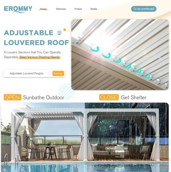 - [ Install & Service ] The components of the EROMMY 10×20 louvered pergola are easy to identify, and the assembly instructions are straightforward and easy to understand. By following the steps in the manual, the installation can be completed by 3-4 people in approximately 2-3 hours. Our service team will respond promptly to any issues.
