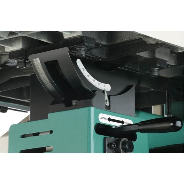The G0636X has an extra-wide 21″ x 25-1/2″ cast-iron table that can tilt from 5° left to 45° right. The cast-iron fence includes an extruded-aluminum resaw fence that attaches quickly and supports tall stock exceptionally well.