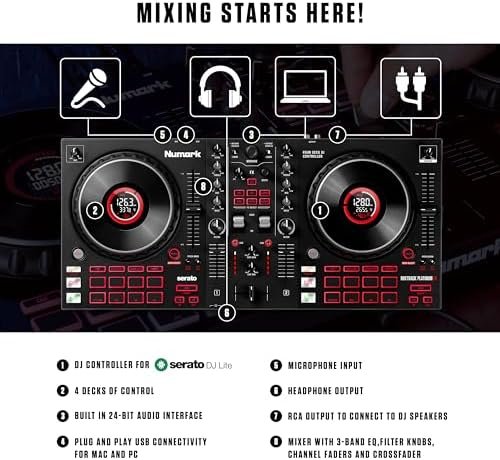 - Ready to Connect To all Your DJ Equipment – Microphone input, headphone output and RCA output to connect to DJ speakers, plus a mixer with 3-band EQ, filter knobs, channel faders and crossfader
